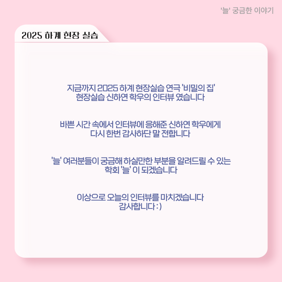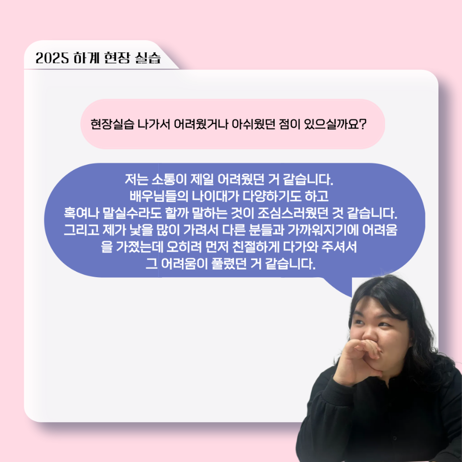 본문 시작 홈으로 커뮤니티 학과소개 입학정보 교수소개 학과과정 커뮤니티 공연예매 안내 홈페이지가이드 포토갤러리 공지사항 포토갤러리 작품DB 동아리 학사일정 학생회 포토갤러리 페이스북 트위터 프린트 ‘늘‘ 궁금한 이야기 - 현장실습 < 신하연 > 연기예술학과 171 2025-10-16 . 목록 이전117회 세명대학교 연기예술학과 하계프로젝트 사랑의 온도 배우 소개 담당부서 : 연기예술학과 담당자 : 박솔빈 연락처 : 043-649-1733 최종수정일 : 2024-10-26 만족도조사 만족도 조사 이 페이지에서 제공하는 정보에 대하여 만족하시나요? 매우만족 만족 보통 불만족 매우불만족