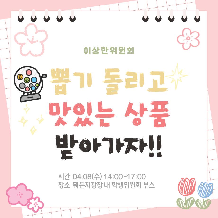 본문 시작 홈으로 공지사항 학생위원회 개요 학생위원회 소개 공지사항 활동결과 홈페이지가이드 프로그램 계획 프로그램 계획 세명대학교 공지사항 프로그램 계획 페이스북 트위터 프린트 [이상한 위원회] 봄바람 타고 온 달콤함 학생처 143 2026-04-08 <특별메뉴 추천 및 학생식당 개선의견 수렴행사> 1. 일시: 2026.04.08(스) 14:00`17:00 2. 장소: 뭐든지 광장 학생위원회 부스 3. 참여방법: 이상한 위원회 인스타 팔로우 하고 의견제시(포스트잇 부착 및 설문조사) 후 간식받자 목록 이전[이상한 위원회] 벚꽃 포토존 운영 담당부서 : 장학복지팀 담당자 : - 연락처 : 043-649-1142 최종수정일 : 2024-10-26 만족도조사 만족도 조사 이 페이지에서 제공하는 정보에 대하여 만족하시나요? 매우만족 만족 보통 불만족 매우불만족