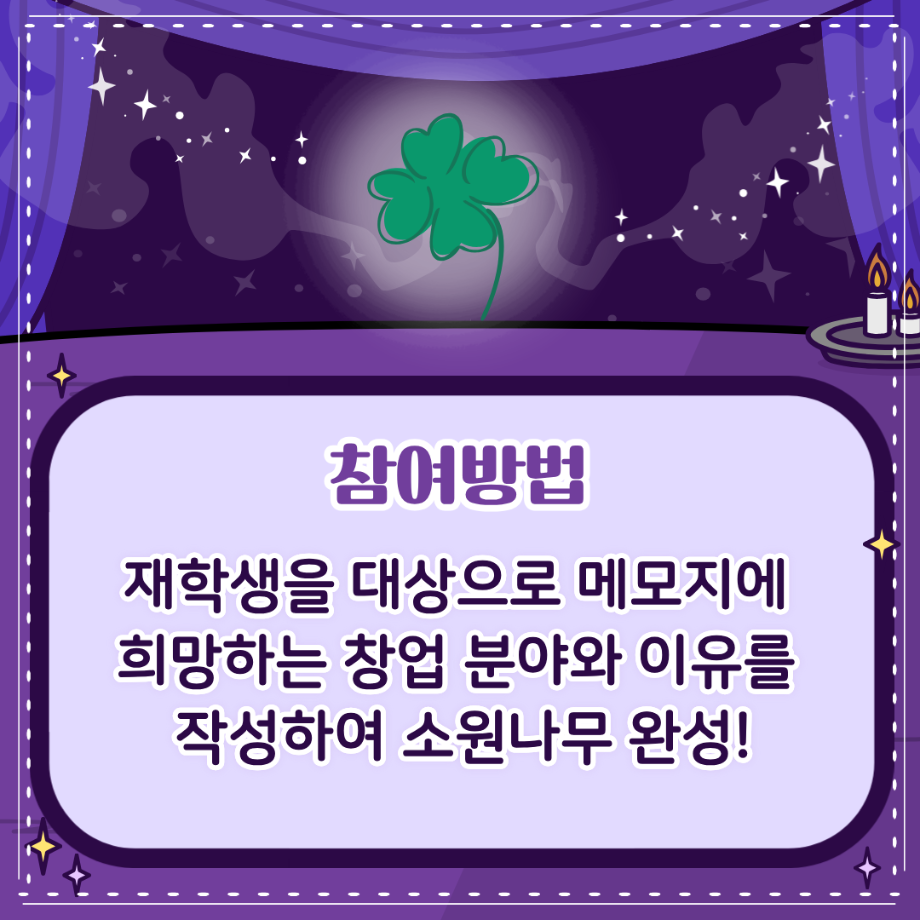 본문 시작 홈으로 공지사항 학생위원회 개요 학생위원회 소개 공지사항 활동결과 홈페이지가이드 프로그램 계획 프로그램 계획 세명대학교 공지사항 프로그램 계획 페이스북 트위터 프린트 [용감한 위원회] 창업? 다 이루어질지니~ 취창업지원처 48 2025-11-05 [용감한 위원회] 창업? 다 이루어질지니~ 📍[용감한 위원회] 창업? 다 이루어질지니~📍 1. 운영일자: 2025. 11. 5.(수) 12:00 ~ 15:00 2. 운영장소: 학생회관 앞 광장 3. 운영방법: 내가 만약 창업을 한다면? 희망하는 창업분야와 이유를 나뭇잎 메모지에 적은 후, 폼보드에 붙여 소원나무를 완성해 주세요! 4. 운영대상: 재학생 및 교직원 즐겁고 재미있는 활동을 할 예정이니, 많은 관심과 참여 부탁드립니다!! 💗💗 목록 이전[건강한 위원회] 보틀크래시 다음 [착한 위원회] 나만의 키 입력 중 담당부서 : 장학복지팀 담당자 : 김효정 연락처 : 043-649-1142 최종수정일 : 2024-10-26 만족도조사 만족도 조사 이 페이지에서 제공하는 정보에 대하여 만족하시나요? 매우만족 만족 보통 불만족 매우불만족