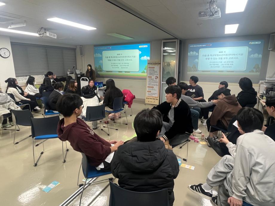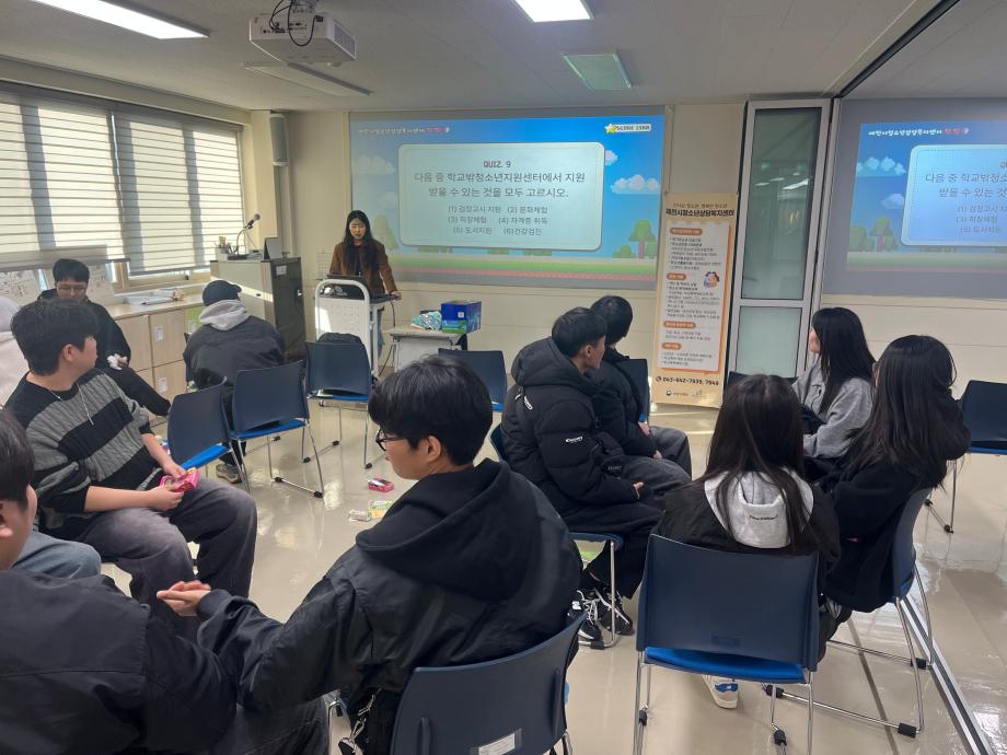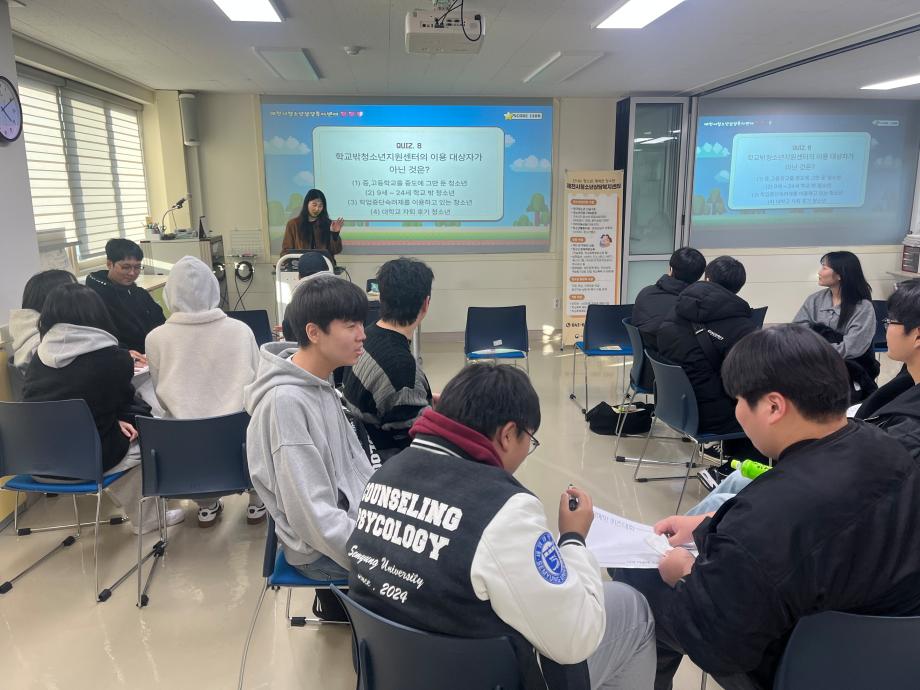 본문 시작 홈으로 학과 커뮤니티 학부소개 교수소개 교육목표 입학안내 학과 커뮤니티 대학원 커뮤니티 홈페이지가이드 학과 갤러리 학과소식 학사일정 학과 갤러리 학과 갤러리 페이스북 트위터 프린트 2025학년도 2학기 현장견학 상담심리학과 302 2025-11-20 안녕하세요 세명대학교 상담심리학과입니다! 지난 3일 상담심리학과 1, 2학년 학생들은 제천시청소년상담복지센터로 현장견학을 떠났습니다! 센터 견학과 퀴즈 프로그램을 통해 상담복지센터에 대해 알 수 있는 뜻깊은 시간이 됐습니다. 오늘의 견학이 앞으로의 진로에 도움이 되고 결정할 수 있는 데에 필요한 시간이 되었으면 합니다 :) 목록 이전나와 어울리는 심리이론은? 다음 12월 학사일정 만족도조사 만족도 조사 이 페이지에서 제공하는 정보에 대하여 만족하시나요? 매우만족 만족 보통 불만족 매우불만족