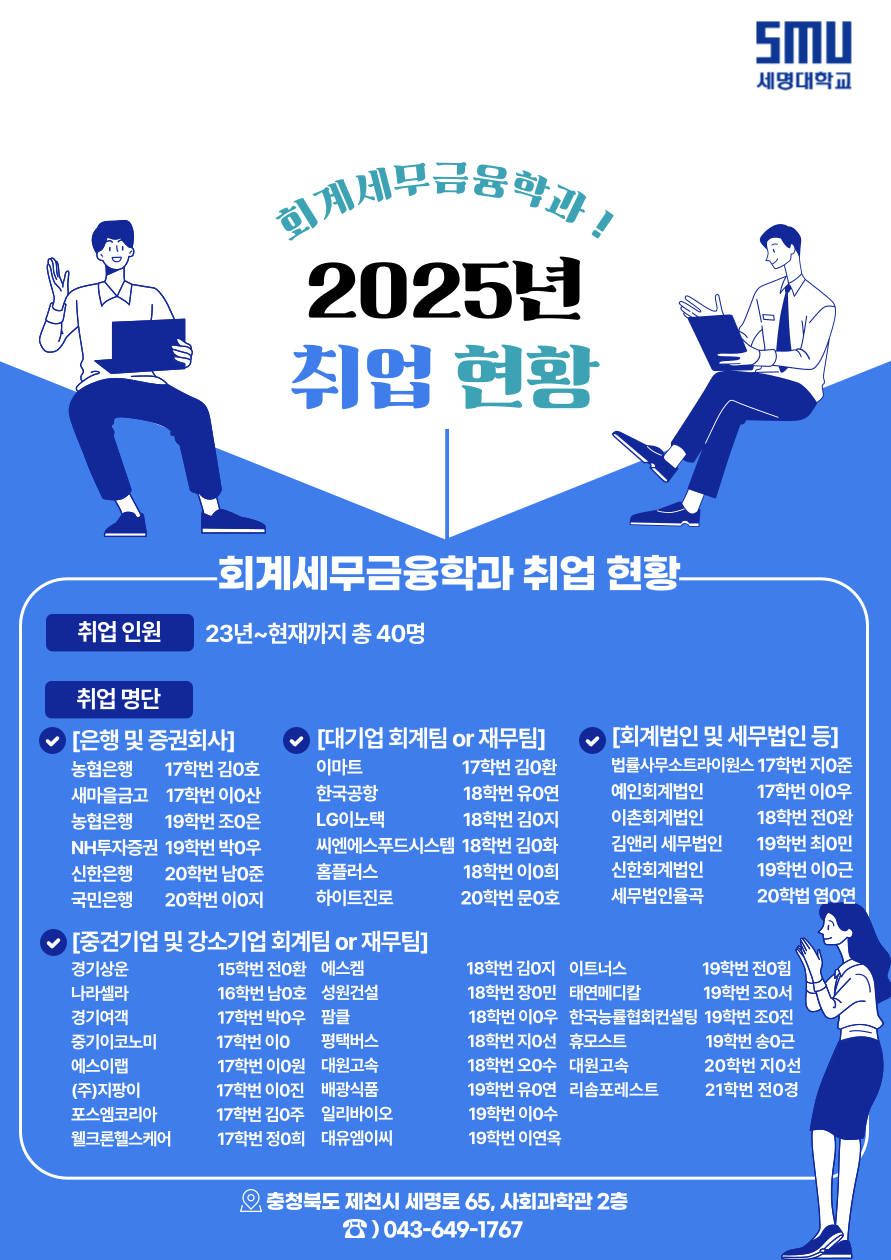본문 시작 홈으로 취업정보 학과소개 취업정보 교육과정 학과소식 홈페이지가이드 취업 현황 취업게시판 진로 자격증소개 취업 현황 취업 현황 페이스북 트위터 프린트 [회계세무금융학과] 2025년도 취업 현황 회계세무금융학과 조회 : 625 등록일 : 2025-07-02 회계세무금융학과의 23년부터 현재까지의 취업 현황입니다 ! 목록 만족도조사 만족도 조사 이 페이지에서 제공하는 정보에 대하여 만족하시나요? 매우만족 만족 보통 불만족 매우불만족