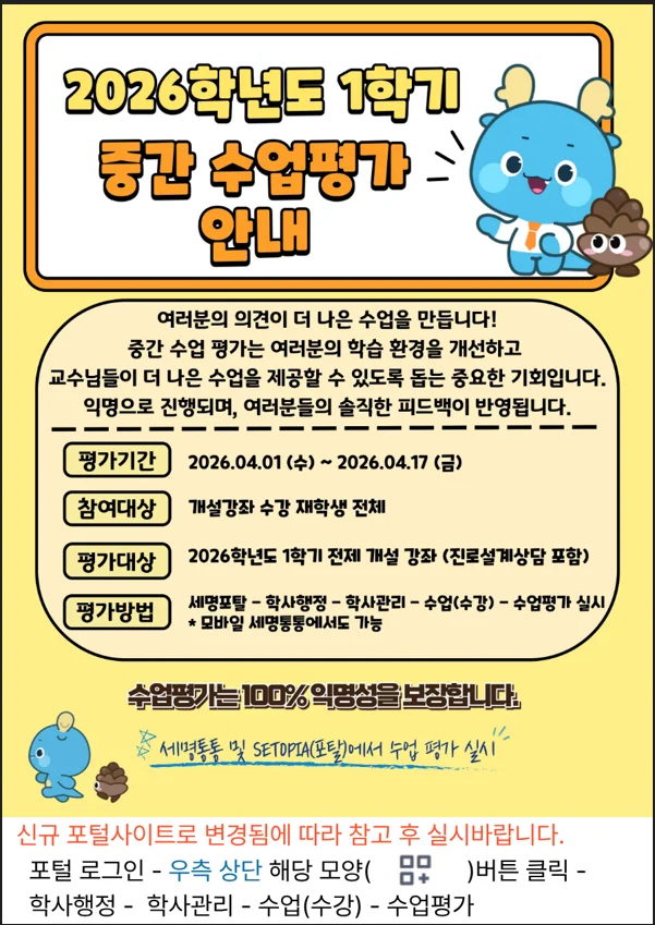 ★ 전체 재학생 ★ 2026학년도 중간수업평가 참여 경로 변경 안내