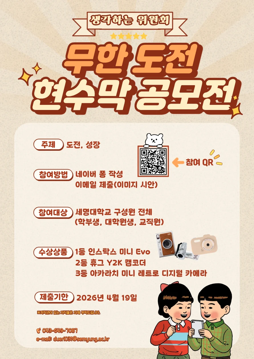 안녕하세요. 재미있는 경험을 위한 학생위원회 ‘생각하는 위원회’입니다! 생각하는 위원회에서 무한도전~! 현수막 공모전을 개최합니다🌸